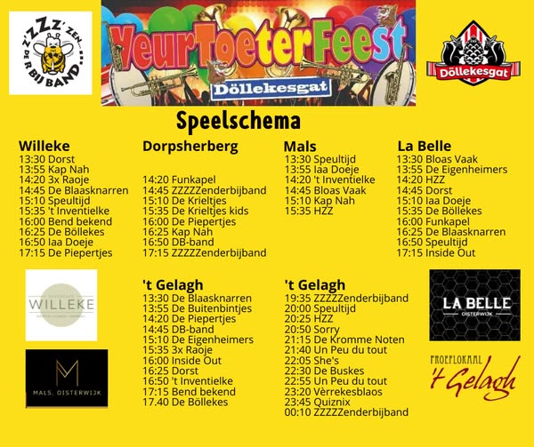Het Döllekesgatse dweilorkest Zzzzzenderbijband organiseert op zaterdagmiddag en -avond 1 maart het Veurtoeterfeest.