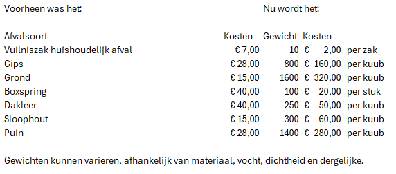 In de nieuwe situatie worden de prijzen bepaald aan de hand van het gewicht, en voor alle afvalsoorten hetzelfde. Dat zorgt er niet alleen voor dat alle afvalsoorten dezelfde prijs kennen, maar ook dat de prijzen aanzienlijk omhoog gaan, en dat kan wel 20 keer meer zijn! Zo kan een kuub grond afgooien zomaar 320 euro gaan kosten!