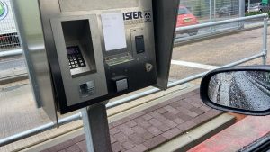 Het verlaten van het terrein is een flinke opgave. Ook hier moet opnieuw een postcode en huisnummer ingevoerd worden. Automobilisten die echter voorzichtig enige afstand houden tot deze afmeldzuil om een aanrijding te voorkomen, of mogelijk lichamelijk minder flexibel zijn, kunnen niet bij het paneel komen. Bij het openen van het portier, om alsnog de benodigde informatie in te toetsen, komt de deur van de auto tegen een ijzeren balk, met schade tot gevolg.