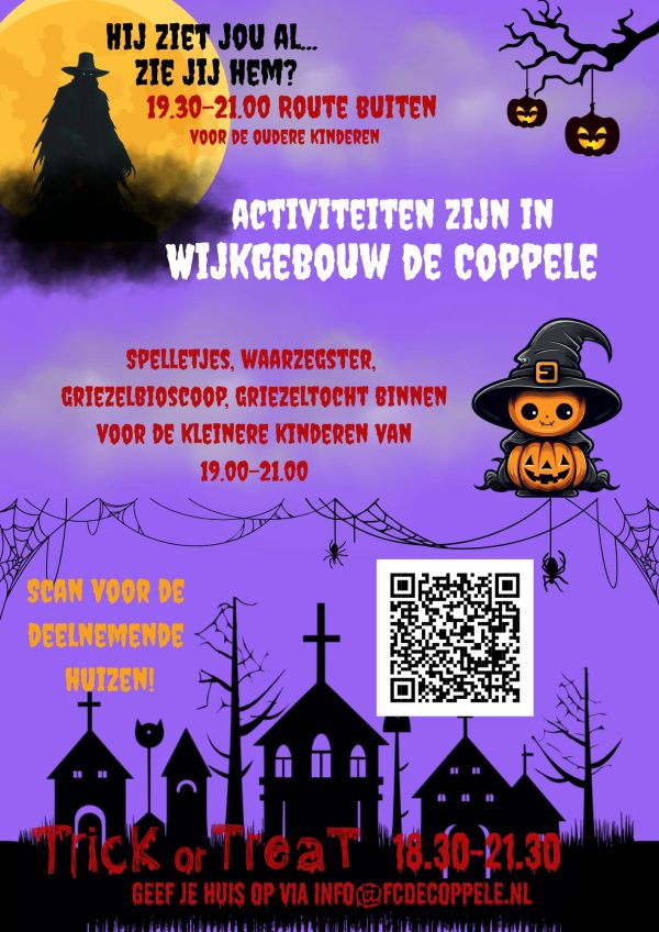 Versier je huis en meld je aan via info@fcdecoppele.nl. Je adres komt dan op de route die de kinderen zaterdag 25 oktober van 19.30-21.00 uur kunnen gaan lopen. In Ontmoetingscentrum de Coppele zijn ook spannende dingen voor de kinderen georganiseerd die avond.