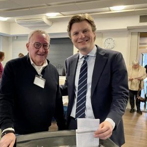 09.50 uur Facebookpagina VVD: ‘Ruben Brekelmans kwam vanmorgen naar het oude Raadhuis in zijn woonplaats Oisterwijk, om zijn stem uit te brengen. Stemlokaal-vrijwilliger Con van Beckhoven maakte de minister wegwijs. #tochmaarweerVVD’