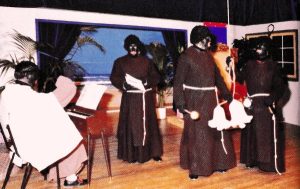 Het beeldmateriaal dat we hier tonen betreft een van de uitvoeringen in 2002. De Goedheiligman wordt dan alweer enkele jaren gestalte gegeven door Frits Kooijmans. In de uitvoeringen van 1982 en 1992 kroop Gerard Koch in de huid van de Spaanse gulle gever. In laatstgenoemde jaren werd de act uitgevoerd door vier pieten i.p.v. drie pieten en de Sint. Aan de houten vloer is te zien dat men dan nog steeds in De Kunstkring speelt. Erik de Laat schoot de beelden vanaf het zijbalkon, de plek waar hij ook het licht en geluid regelde. Nagenoeg twee decennia rustte de techniek van de shows op Eriks schouders.
