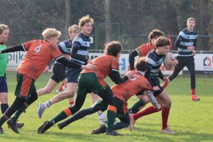 Door Marijn v Beek: We lopen het veld op en iedereen staat te klappen. Ben neemt voor de Oysters de kick-off. Al snel komt Joppe door de lijn en scoort een try. Daarna loopt Joppe door bijna iedereen van Utrecht en scoort nog een try en schiet daarna de conversie ook nog tussen de palen. Toen kwam Utrecht met een antwoord en scoorde een try. De scheidsrechter floot voor halftime (12-5). Daarna scoorden we nog drie try’s en schoot Joppe nog een conversie tussen de palen. Maar Utrecht scoorde ook nog een try en schoot ook een conversie tussen de palen. Uiteindelijk hebben de Oysters met 29-12 gewonnen.