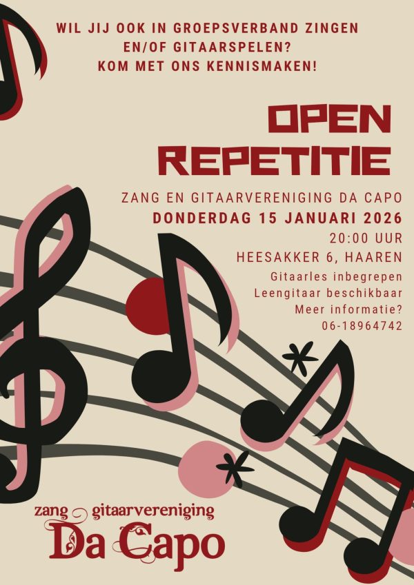 Zang- en gitaarvereniging Da Capo organiseert op donderdag 15 januari om 20.00 uur een open repetitie.