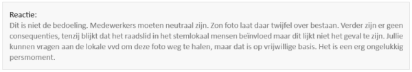 Vrijwilligers van een stembureau behoren zich te onthouden van positieve of negatieve uitingen over partijen en kandidaten; dat was hier duidelijk niet goed gegaan. Vanuit Gemeente Oisterwijk kwam later die dag de mededeling dat er advies was gevraagd aan de adviesraad: ‘Naar aanleiding daarvan is de VVD verzocht de foto te verwijderen.’ De VVD heeft dat niet gedaan; Nieuwsklok heeft dat wel gedaan. Bij navraag achteraf bleek het verzoek niet gericht te zijn aan de partij VVD, maar aan Van Beckhoven (vrijwilliger – raadslid – bladmanager), die dit in uitvoering heeft gebracht bij de uitgeverij. Of hij het verzoek ook aan de partij heeft gericht is onbekend; via de partij is er in ieder geval geen uitvoering aan gegeven.