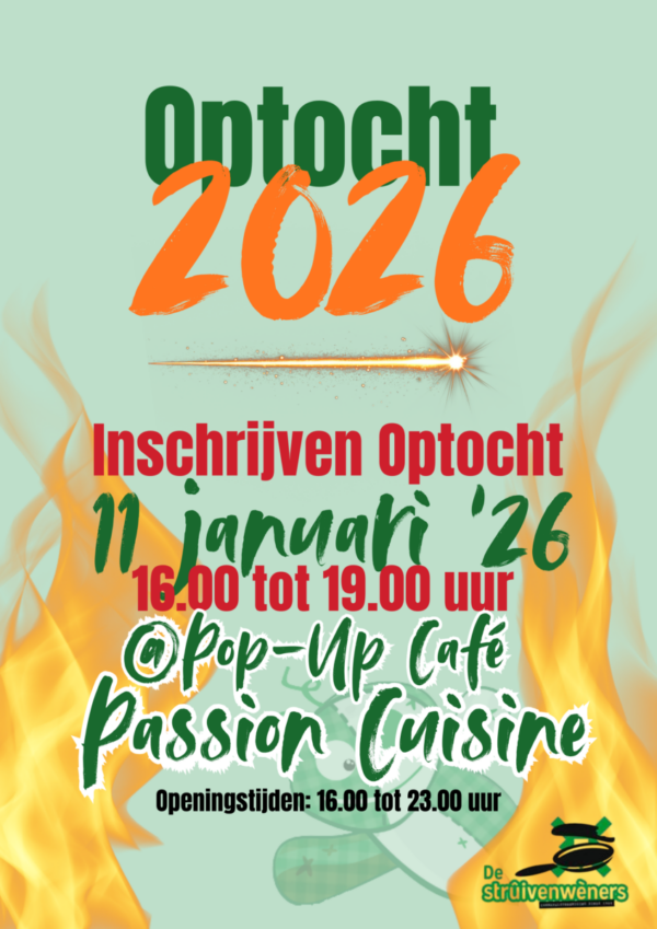 11 januari om 16.00 uur bij Pop-up Café Passion Cuisine. Kom met je vrienden, familie of carnavalsclub. Thema Carnaval 2026: “Strûivendûrp, daor lôôp ik wèrrum vûr!” Motto van de Prins: “Allemaol Anders Saome gruun-wit”