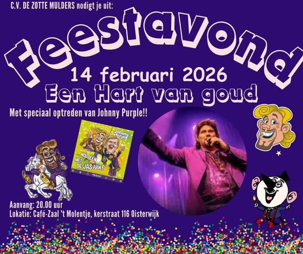 Op 14 februari om 20.00 uur ben je van harte welkom in ’t Molentje Oisterwijk. Daar vieren De Zotte Mulders hun carnavalsfeest “Een hart van goud”!