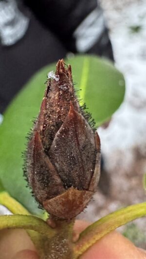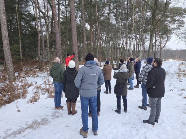 Ger Ewijk – we mogen wel zeggen een paddenstoelendeskundige – begeleide de groep tijdens een wandeling van ruim een uur door de Kampina. Ondanks ijs en sneeuw bleek er genoeg te vertellen en te zien. Het getrainde oog van Ger wees bijvoorbeeld op de minuscule paddenstoeltjes die op een knop van de Laurier zitten (zie foto). Nog geen millimeter groot, met honderden tegelijk, bezetten ze de schil van de knop. Maar ook verkleuringen op dood hout bleken paddenstoelen te zijn, en zelfs vergroeiingen van bomen bevatten een onderliggende paddenstoel. Voor wie meer wil lezen over paddenstoelen in de winter, kan eens een recent artikel van Ger lezen.