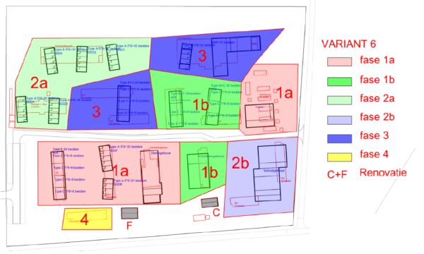 Eind november en begin januari is begonnen met de bouwplaatsinrichting, het ontruimen van de gebouwen in fase 1a (woongebouwen W1 en W3 en activiteitengebouw), verplaatsen leslokaal en stacaravans en de sloop van de gebouwen in fase 1a. Vanaf februari starten de aannemers met de ondergrondse en bovengrondse infra (leidingwerk), en de bouw van nieuwe galerijwoningen en grondgebonden woningen. Vanaf eind maart worden het nieuwe kantoorgebouw en magazijn gerealiseerd. Daarna kunnen enkele nog bestaande gebouwen worden verhuisd naar de nieuwbouw, en kunnen ook die gesloopt worden. Zo volgen er meerdere fases van verhuizing, sloop en nieuwbouw (zie onder).