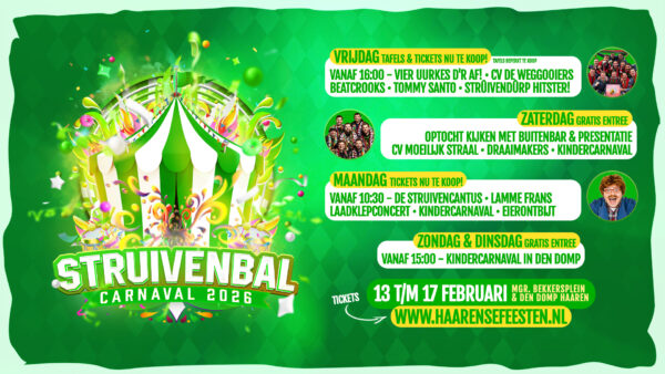 Lamme Frans om maar even iemand te noemen, vele leuke DJ’s, bandjes, kindercarnaval en nog veel meer bij het Struivenbal in Haaren. Dit alles begint op vrijdag de 13e op het Mgr. Bekkersplein. Een deel is gratis; een deel met tickets.