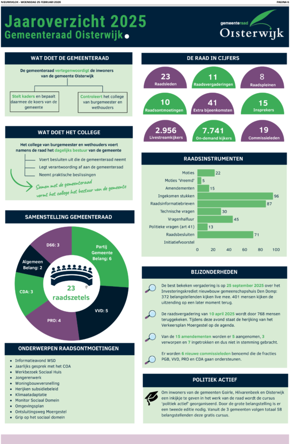 Vorig artikelMilitaire oefeningen in OisterwijkVolgend artikelStadsdichter: Water Vorig artikelMilitaire oefeningen in OisterwijkVolgend artikelStadsdichter: Water Jaaroverzicht Gemeenteraad Oisterwijk 25 februari 2026 Wat er zoal voorbij kwam, wat een gemeenteraad doet, u ziet het in dit overzicht: Meer gemeentenieuws en politiek Agenda Deel dit bericht: FacebookTwitterWhatsAppLinkedinEmail Gerelateerd - Meer >> Gemeente Militaire oefeningen in Oisterwijk 25 februari 2026 Alles Persverklaring: Reactie op beschuldigingen door VVD Oisterwijk 24 februari 2026 Feed Partij WIJ! Oisterwijk: Kieskompas, ProDemos en de Alternatieve stemhulp van Oisterwijk Nieuws 24 februari 2026 Feed Gemeente Oisterwijk: Informatieavond Oisterwijk Isoleert in Moergestel 24 februari 2026 Laatste nieuws - Meer >> Oisterwijk Theaterportret Helga Deen in Tiliander Oisterwijk 25 februari 2026 Film Stadsdichter: Water 25 februari 2026 Gemeente Militaire oefeningen in Oisterwijk 25 februari 2026 112 Hennepkwekerij aangetroffen in Oisterwijk 24 februari 2026