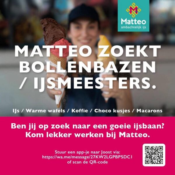 Ben jij op zoek naar een leuk bijbaantje? … nou dat treft, IJssalon Matteo zoekt leuke mensen die het team willen versterken.