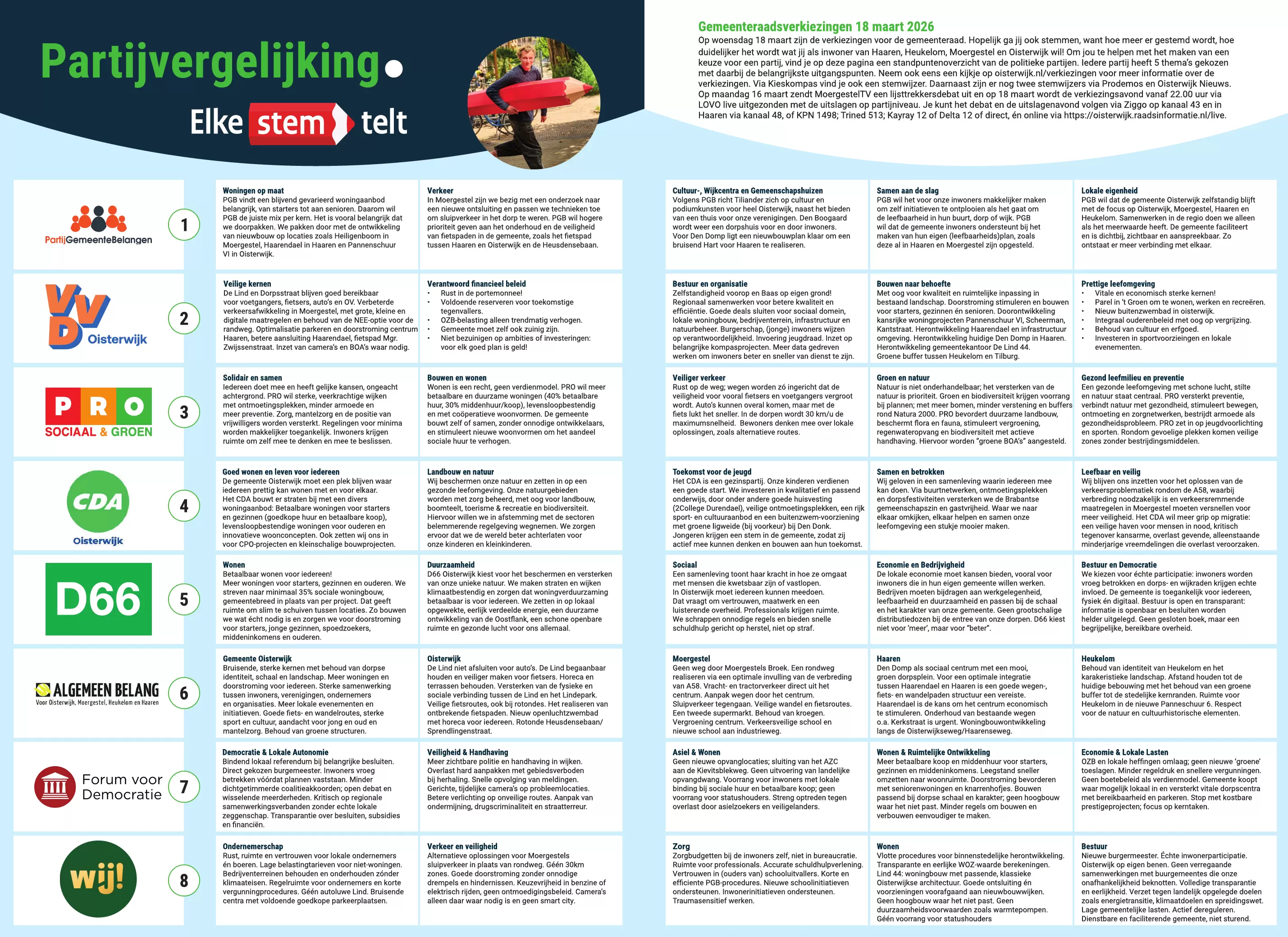Naast het overzicht op onze website, en de diverse kieswijzers die u kunt volgen, heeft Gemeente Oisterwijk een overzicht gemaakt van de partijen met hun standpunten.