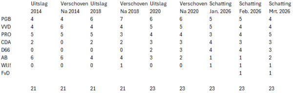 We hebben begin januari een voorspelling gedaan, met per partij een motivatie van onze indruk. Ten opzichte van die voorspelling zijn er enkele verschuivingen zichtbaar. Om te beginnen door de deelname van FvD. Die partij geeft lokaal nog niet veel aandacht aan de kiezer, maar groeit landelijk wel in ledenaantal. Ook zien we dat bijvoorbeeld AB, die eerst haast onzichtbaar was in hun uitingen, de laatste weken flink aan de weg heeft getimmerd. Verder hebben we een peiling gedaan die vanwege de lage aantallen deelnemers niet 1 op 1 geschikt is voor publicatie, maar wel een beeld geeft dat we ook in de cijfers van onze stemhulp terugzien: PRO stijgt!